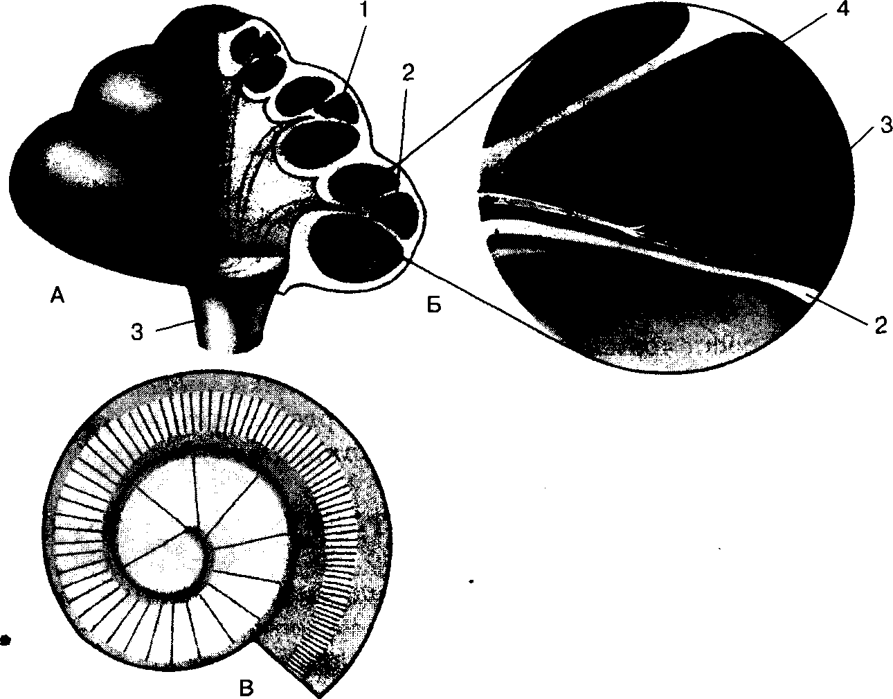 А — вскрытая улитка: 1 — положение спирального органа в улитке; 2 — основная мембрана; 3 — слуховой нерв; Б — спиральный орган: 2 — основная мембрана; 3 — волосковые клетки (рецепторы слуха); 4 — покровная пластинка; В — основная мембрана, состоящая из волокон разной длины и толщины, несущих волосковые клетки (вид сверху) и способных отзываться на звуки разной высоты. Деформация волосков клеток (3) при колебании основной мембраны вызывает возбуждение слуховых рецепторов