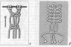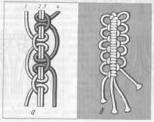 Нарізають мотузки визначеної довжини, складають їх разом, знаходять середину, кріплять на подушці і плетуть вузликовий ланцюжок згідно інструкційної карти.