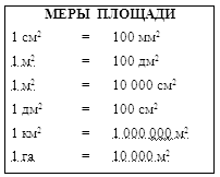 ЦЕЛИ: Дать предоставление о квадратном метре; закрепить умение учащихся находить площади различных фигур (многоугольник); воспитывать чувство взаимоподдержки и выручки; продолжить работу над формированием вычислительных навыков; развивать логическое мышление.