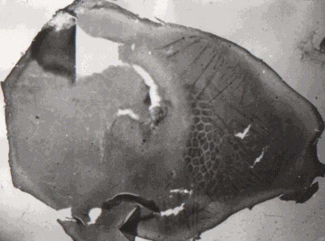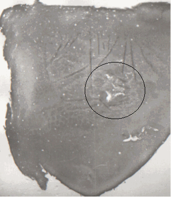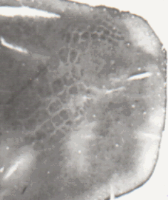 В отличие от "блобс" приматов, разделенных протяженными промежуточными зонами мы заранее знали (по результатам предыдущих исследований, что эти зоны значительно уже (Чебкасов,1998). Соответственно необходимо была особая точность резания при изготовлении тангенциальных препаратов слоя Ш. Здесь нам на помощь вновь пришел метод резания, разработанный Е.Н. Стадниковым. Если бы не этот метод можно было заранее ожидать тех же результатов, что получили для грызунов Хьюбел с сотрудниками, которые не смогли выявить "блобс" у грызунов. - Причина в том, что узкие промежуточные зоны между "блобс" будут выявляться на плане коры лишь тогда, когда будут ориентированы по нормали к плоскости среза. При скосе, с учетом толщины среза в 75мкм, мы неизбежно получили бы равномерное распределение окраски - промежутки между "блобс" в проекции коры оказались бы закрыты для наблюдения.