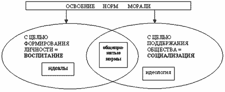 Чем больше степень пересечения этих двух сфер, тем ближе цели развития общества, отраженные в идеологии, к целям развития личности, отраженным в нравственных идеалах. Воспитание основывается преимущественно на нравственных идеалах и общепринятых нормах морали и права; социализация - на идеологии, государственной политике и тоже на общепринятых нормах морали и права. Понятно, что как идеалы проникают и присутствуют в социализации, так и идеология влияет на воспитание. Взаимопроникновение происходит через впитывание общепринятыми нормами и нравственных идеалов, и идеологий.