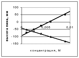 На рисунке показаны результаты калибровки хроматографа по гидрокарбонату. Прямая N1 иллюстрирует изменение высоты пиков гидрокарбоната, а прямая N2 - высоты необычных пиков нитрата. Отрицательные высоты пиков говорят о том, что вместо пиков на хроматограмме присутствуют впадины.