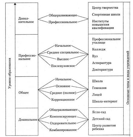Российское образование представляет собой непрерывную систему последовательных уровней, на каждом из которых функционируют государственные, негосударственные, муниципальные образовательные учреждения разных типов и видов: