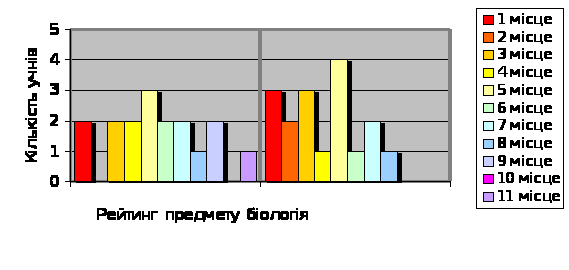Рис. 5. Зміна рейтингу предмету біологія на початок експерименту та після проведення ( ЗОШ І-ІІІ ст. № 59, 8-А клас)