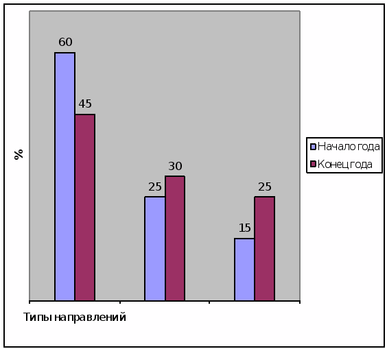 В конце эксперимента: наблюдаем тенденцию уравнивания типов направленностей (40%,30%, 25%), что характеризует позитивность в складывающемся стиле педагогической деятельности, поскольку в педагогической деятельности необходимо иметь направленность на совместные дела, при решении совместных задач.