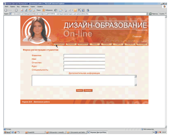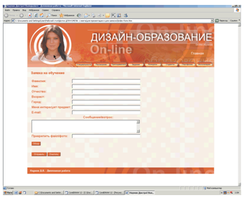 Вот мы теперь перешли на следующую страницу,(рис 1.2.) где пользователь (будущий студент сайта) заполняет анкету и оправляет её по нужному адресу и мы теперь переходим на главную страницу нажатием на изображение девушки.