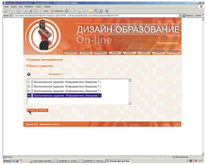 После нажатия на папку «работы студентов»(рис 1.9.), он переходит на страницу где, он может скачать выполненную работу студента себе на компьютер и дома и на рабочем месте. Потом мы, переходим на следующую страницу, нажимая на кнопку «задания».