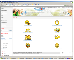 Обучение происходит следующим образом: студент регистрируется и знакомится с системой обучения и системой оплаты за обучение на главной странице, и он автоматически присоединяется к списку уже в данный момент зарегистрированных студентов. Он заходит на рубрику «задания» и скачивает себе на компьютер информацию, выполняет, задание и потом по e-mail отправляет преподавателю, возможно даже с вопросами, вопросы можно будет задавать с помощью программы ICQ, по выполнению заданий и их сдаче, он будет ориентироваться, по расписанию. На сайте он сможет задавать вопросы преподавателю как в of-line режиме, так и в on-line режиме на сайте много интересных рубрик, где он найдёт много интересной для себя информации: фотографии студентов, фотографии о конкурсах, фотографии преподавателей, информацию о факультете, о специальностях, новости и будет себя чувствовать как студент, который учиться в реальном университете.