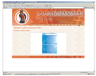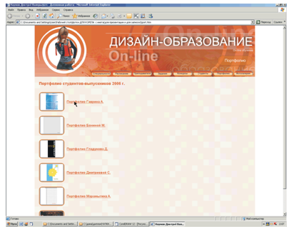 Мы находимся на странице (рис 1.14.) «портфолио», где мы наблюдаем портфолио студентов. Нажимая на ссылку «портфолио» по своему выбору, мы сможем посмотреть его в увеличенном виде. Потом мы переходим на следующую страницу.