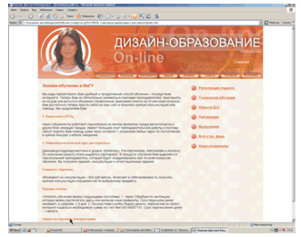 Описание дизайна сайта: вверху располагается шапка т.е. главная часть сайта на которой располагаются название сайта и символика (логотип) on-line обучения и самого сайта ещё имеются фотографии на фоне белого символа на которых изображены девушки которые своими действиями отображают ту рубрику на которой вы в данный момент сайта находитесь. Так же на шапке расположены кнопки прямоугольной формы с закруглёнными углами так же выполненные в оранжевом цвете. Количество кнопок составляет восемь штук со следующими рубриками: специальности, расписание, преподаватели, задания, портфолио, фотогалерея, студенты, конкурсы не большого размера которые сопровождаются анимацией нажатия кнопки что даёт эффект настоящей нажимающейся кнопки. расположение пользователя на сайте как я ранее говорил, пишется на шапке в правой стороне. Фон выполнен из маленьких квадратиков разного цвета который, на мой взгляд, символизируют движение и пространство и возможно даже глобальную сеть Интернет.