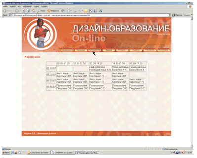 Мы перешли на страницу «расписание» (рис 1.6.)здесь студент сможет по расписанию какие задания можно будет скачать себе на компюютер, что бы потом выполнить его спокойно в домашних условиях и по времени можно будет спросить или задать вопрос преподавателю по данному предмету. Поттом мы переходим на страницу «преподаватели», где он сможет увидеть фотографии преподавателей и их E-mail и ICQ для консультации по предметам.
