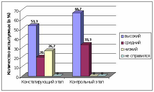 Не выявлено на контрольном этапе исследования ни одного ребенка, который бы не справился с заданием, а таких на начало работы было 4 ребенка (26,7%).