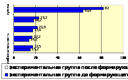 Итак, после проведения психодиагностического обследования с помощью батареи тестовых методик Вильямса можно заключить, что после проведения формирующего эксперимента по развитию гибкости мышления старшеклассников у большинства учащихся экспериментального класса повысились показатели развития не только этого качества, но и других творческих способностей. Их показатели стали соответствовать умеренно-высокой норме развития креативных способностей. Динамика в контрольной группе была не столь существенна, и большинство учащихся осталось на своем уровне развития творческих способностей.