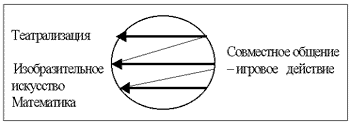Взаимопроникающая форма строится на основе одного вида деятельности, например игровой, в которую органично вплетаются другие: познавательные, слушание музыки, восприятие живописи и др. (см приложение E, рис. 4). Эта форма чаще всего реализуется в начальной школе. Известны такие виды уроков, как урок-спектакль, урок-сказка, урок- расследование и т.п. Например, в ходе урока-путешествия «В стране Геометрии» (2-й класс) дети включаются в самостоятельную игровую деятельность. Учитель строит общение с целью раскрытия «тайны царицы Геометрии и ее окружения». На основе этого разворачивается эстетическая деятельность, связанная с восприятием изобразительного искусства (иллюстрации, модели изб, теремов и других построек), творчество – выполнение аппликации «Царство Геометрии», театрализации – самовыражение в образах окружения царицы Геометрии и т.д. Учитель должен умело переключать детей с одного вида деятельности на другой (с сюжетно-ролевой игры – на дидактическую, затем – на строительно-конструктивную, театральную и т.д.). Объем содержания и степень проникновения другого вида деятельности в основную зависит от поставленных учителем задач и уровня развития учащихся данного класса.