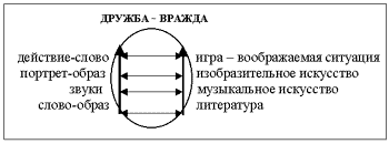 Контрастная форма строится на диалоге и показе контрастных граней мира, на раскрытии ценности через ее противоположности (добро – зло), познании целого через часть, множества и через единичность и т.п. (см приложение E, рис. 3). Интеграция содержания в этом случае создает условия для возникновения диалогов культуры, искусства, личностей; стимулирует общение, обмен знаниями между учащимися и педагогом, обеспечивает поиск способов деятельности; побуждает детей к рефлексии, самооценке. Например, чтение и обсуждение рассказов В. Осеевой «Синие листья», сказки В. Катаева «Цветик-семицветик» раскрывает перед учащимися ценность дружбы в сравнении с ненавистью, враждой. Данная форма организации содержания позволяет развивать мотивацию. Дети всегда стремятся осмыслить и упорядочить окружающий их мир, сталкиваясь с противоречиями, они стараются дать им объяснения. Задача учителя – организовать общение так, чтобы раскрыть учащимся достоинства подобной ценности и ее значимость в жизни; стимулировать потребность учащихся в ее обретении.