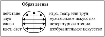 Пластообразная – наслоение различных видов деятельности (познавательных, художественно-эстетических, игровых, коммуникативных и т.п.), содержание которых пронизано одной ценностью или объектом познания. (см приложение E, рис. 1). Например, образ природы (весна) раскрывается в изобразительном искусстве, в его различных жанрах (натюрморте, пейзаже), отображается посредством цвета, света, композиции; в литературе – через художественные средства выразительности в тексте; в музыке – через звуки природы, песни и т.п.