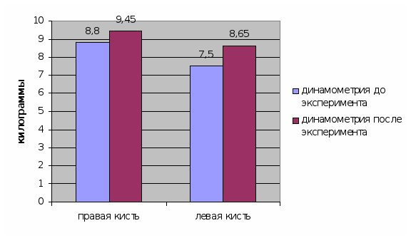 Сравнивая результаты степени развития силовых показателей у детей с нарушением речи до и после проведения комплекса речедвигательной гимнастики, можно констатировать, что произошло увеличение динамометрии правой и левой кисти на 7% (0,65 кг) и 15,3% (1,15 кг) соответственно.