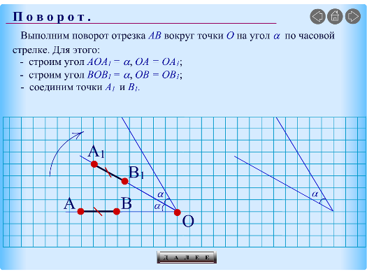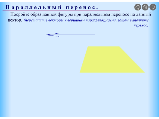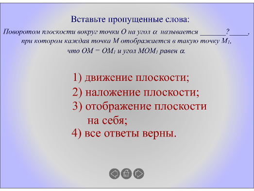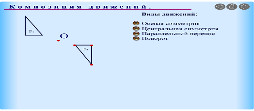 Для реализации третьей и четвертой задач было создано мультимедийное дидактическое пособие по теме «Движения на уроках геометрии» и разработаны методические указания к его использованию.