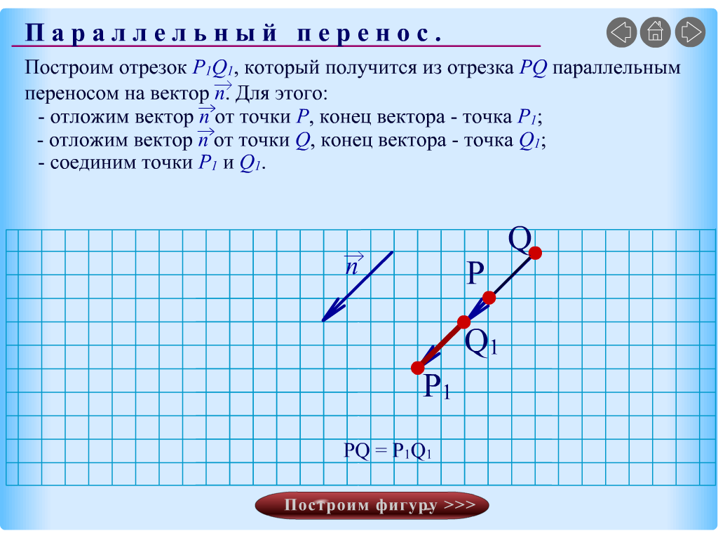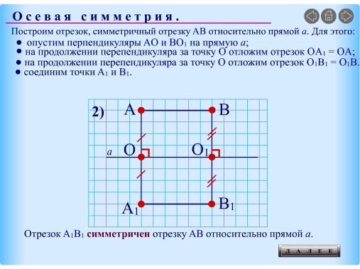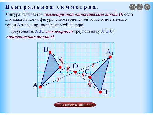 Как показала опытная проверка, материал вполне доступен ученикам. После заслушивания объяснений учителя и просмотра соответствующих сцен мультимедийного пособия ученики правильно отвечали на поставленные вопросы, определяли вид перемещения, могли строить образы фигур при осевой и центральной симметрии, когда ось совпадала с линейкой клетчатой бумаги. После этого они учились строить фигуру симметричную данной, когда ось не совпадала ни с одной из линеек клетчатой сетки бумаги. При этом обнаружилось, что некоторые ученики не вполне владеют угольником и линейкой для построения образа точки.