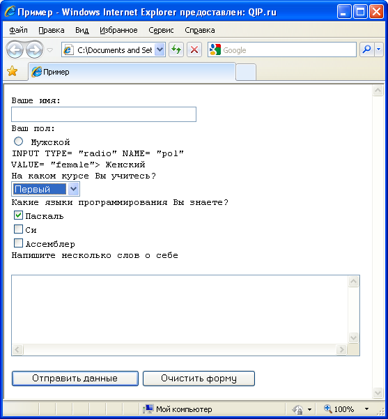 <INPUT> TYPE=”radio” – создает переключатели (радиокнопки)