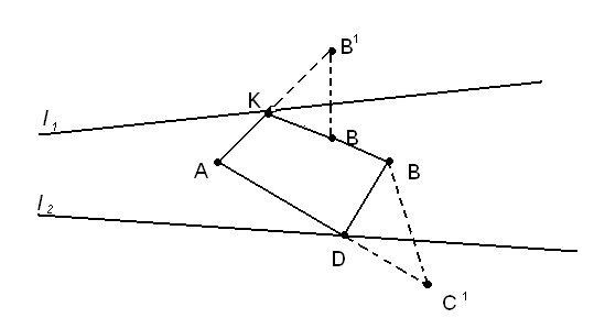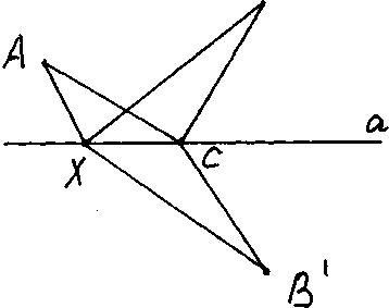 Выполним следующее построение. Построим точки D1 и Е1, симметричные D и Е относительно АС и ВС. Построим также точку D2, симметричную D1 относительно АВ. Проведем отрезок D2Е1 и построим ломаную DMKLE. Длина ее равна длине отрезка D2Е1. Легко сообразить, что всякий иной путь из D в Е, с тем же порядком захода на стороны данного треугольника, будет длиннее. Но можно было бы порядок захода на стороны треугольника избрать иной (выполнив такие же построения). Всего таких ломаных линий, как DMKLE, получится три. Останется выбрать из них имеющую наименьшую длину, для чего достаточно сравнить три таких отрезка, как D2E1.