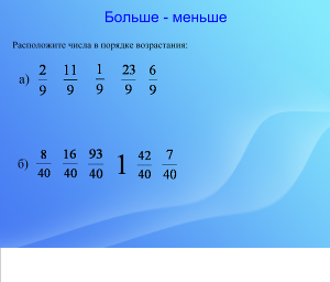 На данном уроке учащиеся знакомятся с правилами сравнения дробей. На этапе закрепления изученного материала текст задания представлен на экране, а решение может быть как частично разобрано, так и выведено учащимися на уроке самостоятельно. Объекты, созданные в режиме интерактивной доски, являются подвижными – их можно передвигать в нужном направлении и изменять линейные размеры.