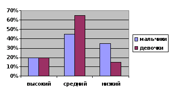 Таким образом, в целом в группе испытуемых преобладает средний уровень интеллекта. При этом % мальчиков и девочек с высоким уровнем интеллекта имеет одинаковое значение, и составляет 20%. Средний уровень интеллекта показали 65% девочек и 45% мальчиков, Низкий – 35% мальчиков и 15% девочек.