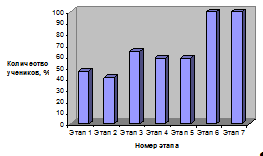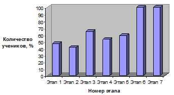 На первых этапах, когда проводилось обсуждение предстоящей работы, не все учащиеся были вовлечены в процесс подготовки к выполнению проекта. Уже на третьем этапе работы наблюдалось полноценное участие всех учеников в работе над проектом (рис. 2.7).