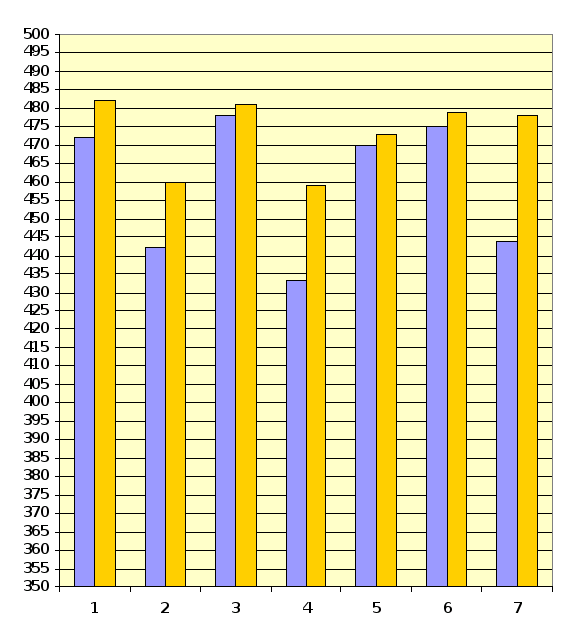 Желтый – результаты контрольной группы на контрольном этапе эксперимента.