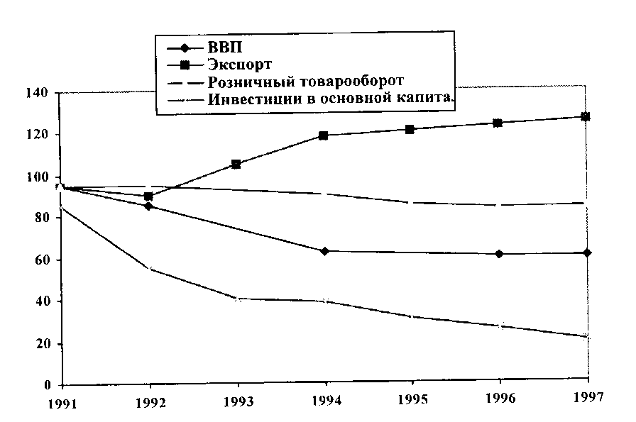 Рисунок 2. Индексы ВВП, экспорта, внутреннего потребительского и инвестиционного спроса в России в 1991-1997 гг (1990 г. = 100 %).