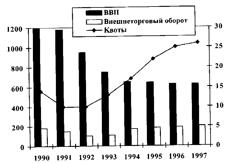 Неудивительно, что уровень функциональной открытости СССР на протяжении всей его истории оставался низким. Если экспортная квота России в 1913 г. составляла 10,4 %, то в 20-е годы в СССР она не превышала 3-3,5, а к 1937 г. упадало 0,5 %. В послевоенный период она вновь стала расти - главным образом по линиям торговли со странами СЭВ и экспорта военной техники в развивающиеся страны «социалистической ориентации». К концу 80-х годов экспортная квота достигла 5,6 %, к 1990 г. - 6,1%. Полная же внешнеторговая квота СССР в 1990 г составила 13,2 %, а при пересчете ВВП по паритету покупательной способности рубля (что точнее отражает реальный объем ВВП) -12,3, в том числе по РСФСР -13,3 %. Лишь с началом реформ положение стало меняться: после некоторого спада в 1991-1992 гг. внешнеторговая квота России начала расти, а с 1992 г. по 1997 г. она повысилась в 2,4 раза (см. рис. 1). Это значит, что вовлеченность России в мирохозяйственные процессы через внешнюю торговлю более чем удвоилась. Особенно наглядно это видно на примере экспортоориентированных отраслей. Так, доля вывоза в производстве древесины повысилась с 6,8% в 1992 г. до 19 в 1997 г.; нефтепродуктов - соответственно с 14,8 до 33,0; природного газа - с 32,2 до 36,5; нефти - с 35,4 до 42,0; минеральных удобрений - с 69,3 до 74,4; целлюлозы - с 40,8 до 83%2. Это играет важную позитивную роль в нашей кризисной ситуации, когда внутренний потребительский спрос и инвестиции продолжают падать (см. рис. 2). Внешние рынки сбыта позволяют держаться на плаву ряду отраслей российской промышленности, получать устойчивые экспортные доходы, пополнять бюджет и тем самым поддерживать общий тонус экономики, удерживая ее от еще более глубокого спада. Но это лишь одна сторона медали.