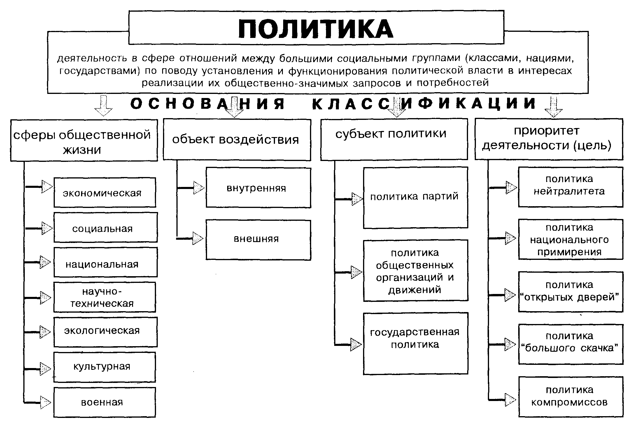 ПОЛИТИКА происходит от греч. polis - город- государство и прилагательного от него - politikos: все, что связано с городом, - государство, гражданин и пр. - организационная и регулятивно-контрольная сфера общества, основная в системе других таких же сфер: экономической, идеологической, правовой, культурной, религиозной. Термин Политика получил распространение под влиянием трактата Аристотеля о государстве, правлении и правительстве, названного им "Политика". Вплоть до кон. XIX в. Политика традиционно рассматривалась как учение о государстве, т.е. власти институционального, государственного уровня. Однако уже в Новое время развитие политической мысли и представлений о государстве привело к выделению наук о государстве и их обособлению от политической философии и политической науки. Представление о политике значительно расширилось, и понимание политики стало весьма сложной проблемой, во всяком случае, оно оказалось предметом самых различных толкований. В настоящее время можно выделить не менее четырех основных толкований политики: