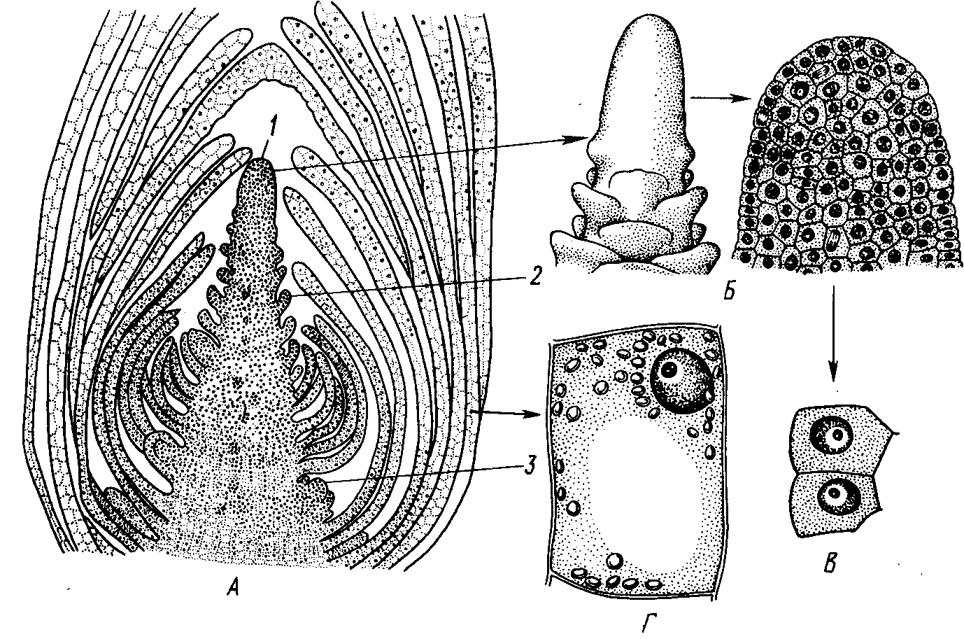 Рис. 1. Верхушечная меристема побега элодеи. А — продольный срез; 5 — конус нарастания (внешний вид и продольный срез); В — клетки первичной меристемы;