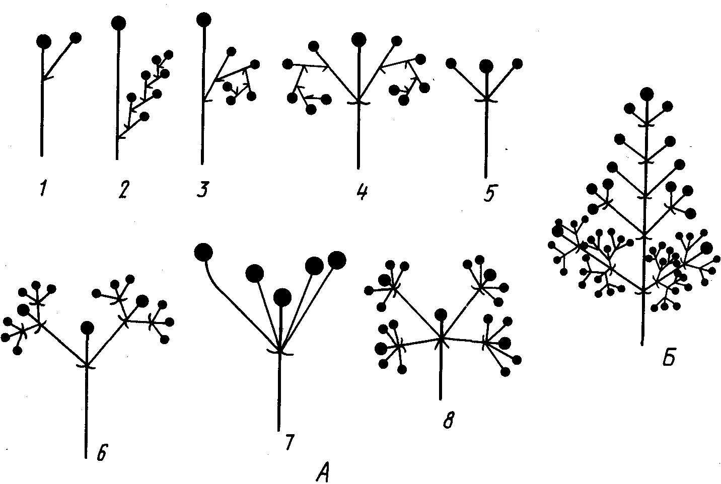 1-кисть, 2 — колос, 3 — початок, 4 — простой зонтик, 5 - головка, 6 — корзинка, 7 — щиток (4. 5, 6 — с укороченной главной осью, прочие — с удлиненной);