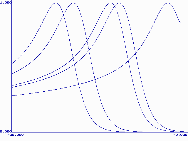 Были составлены таблицы значений (bt) при разных значениях H. На рис. 3 приведены нормированные (все максимумы сведены в точку (0;1)) графики функции (bt) при H=0.1, 1, 3, 10, 100, 1000, 10000, 170000. Из этого рисунка видно, что при больших H форма кривой становится постоянной. Высота максимума при H100 почти не меняется (0.2980.002), а потенциал максимума смещается в область более положительных значений согласно уравнению (26):