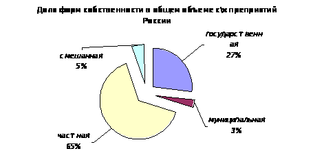 По формам собственности сельскохозяйственные предприятия разделились следующим образом: государственная (Федеральная и субъектов Федерации) - 27%, муниципальная 3%, частная 65%, смешанная форма 5%. Таким образом, основной формой собственности в сельскохозяйственном производстве стала частная собственность.