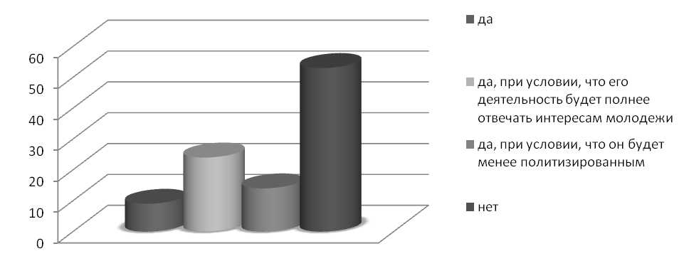 Результаты говорят о том, что молодежь не готова и не имеет желания вступать ни в какие молодежные общественные организации. Некоторая часть респондентов готова на этот шаг, но при условии, что деятельность объединения будет менее политизирована и будет больше соответствовать интересам молодежи. Так же стоит взять во внимание, факт существования большого количества неформальных движений, являющихся альтернативой легальным организациям.