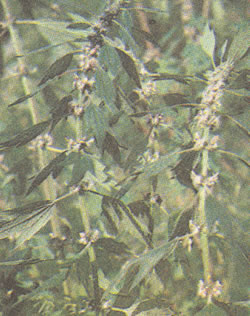 Заготовка и качество сырья. Дикорастущий пустырник заготавливают в начале цветения нижних цветочных мутовок, срезая ножами, серпами или секаторами верхушки стеблей и боковых побегов с цветками и листьями. В сырье не допускаются грубые стебли толще 5 мм, а также поврежденные или пожелтевшие листья. Уборку. лучше проводить после схода росы в сухую погоду. Срезанную траву быстро отправляют в сушилки, на чердаки или под навесы, не допуская самосогревания зеленой массы. При естественной сушке необходимо обеспечить хорошую вентиляцию, расстелить траву на ткани, бумаге или на другой чистой поверхности слоем 5—7 см толщины и периодически перемешивать ее. При строгом соблюдении правил заготовки заросли можно использовать 4—5 лет подряд, после чего делается перерыв на 1 год. Сырье дикорастущего пустырника должно иметь характерный слабый запах, горьковатый вкус, содержать не менее 15% экстрактивных веществ и соответствовать другим требованиям Фармакопейной статьи ФС 42-2135—83. Высушенную и затаренную в мешки или тюки траву пустырника хранят на стеллажах в сухих, хорошо проветриваемых складских помещениях. Срок годности 3 года.