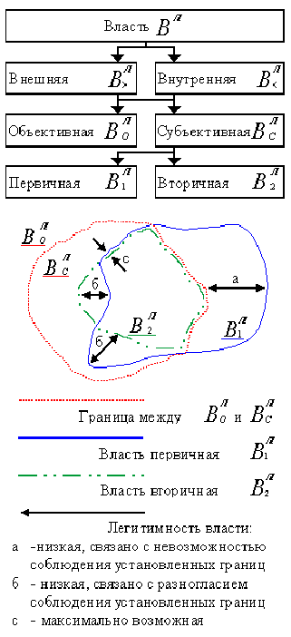 От субъективной и объективной властей, зависит такое понятие как легитимность власти, которая выражается в расхождении в определении границ между первичной и вторичной властью. На это расхождение влияют два фактора – невозможность соблюдения границ (проявление объективной власти), и различная несогласованность в процессе их соблюдения (проявление субъективной власти).