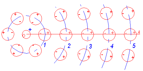 Проделаем теперь мысленный эксперимент. Попробуем придать электрону атома 1 (рис. 1), который расположен наиболее близко к иону в центре сави, толчок в направлении иона. Если этот толчок будет достаточно сильным, то электрон сможет покинуть свой протон и образует с до этого свободным протоном новый нейтральный атом (водорода). Обозначим минимальную энергию, которая для этого понадобилась, знаком E1. Если бы мы сделали то же самое с электроном следующего атома на линии OA, с электроном атома 2, то требующаяся для отрыва электрона энергия была бы несколько больше, чем E1, так как атом 2 находится в области более слабого поля иона и его электрон притягивается ионом с меньшей силой, чем электрон атома 1. Обозначим эту энергию аналогично знаком E2 и отметим: E2 > E1. Повторив то же самое с электроном атома 3, мы из тех же соображений получим, что E3 > E2 и т.д.. Продолжая последовательно эти размышления, мы получим: