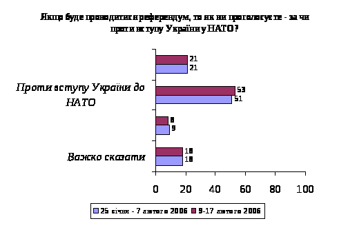 В результаті загальнонаціонального політичного столу у серпні 2006 року було підписано Універсал національної єдності, в тексті якого зазначено, що питання про вступ до НАТО буде вирішено за результатами референдуму5. Як ми бачимо з графіку 53% населення проголосували б проти вступу України у НАТО і лише 21% - за.