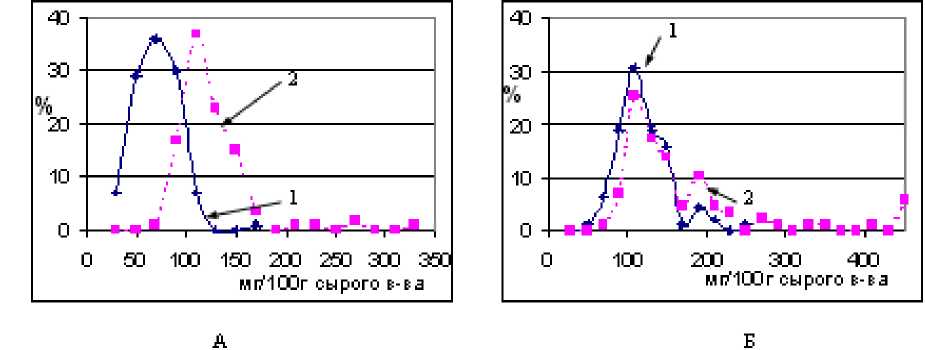Более существенно различия между сортами проявились при анализе внутрипопуляционной изменчивости этих показателей (рис.1). В 1996 году 65% растений популяции д-2 содержали от 3,0 до 3,5% белка на сырой вес, а в 1997 количество таких растений осталось почти прежним и составило 62,2%.