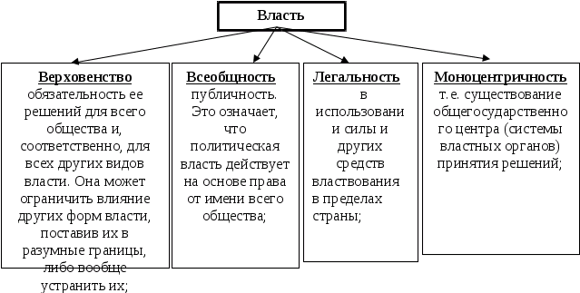 Отличительные признаки власти проистекают из ее природы и выражаются в легальности использования силы, публичности (всеобщности и безличности), многообразии экономических, социальных и других ресурсов, моноцентричности и стремлению к абсолютизации (рис.1).