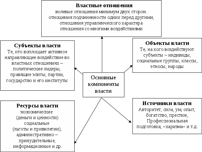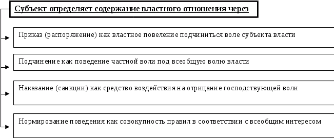 Отношения власти предполагают наличие субъекта и объекта (или второго, пассивного субъекта), отношений господства и подчинения, побуждения к действию и его совершения по желанию первого субъекта.