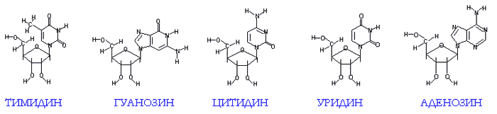 В указанных процессах принимают участие белки, нуклеиновые кислоты и разнообразные вспомогательные факторы. Мы не будем рассматривать последние, а остановимся подробно на первых двух.Нуклеиновые кислоты (НК) подразделяются на два типа: рибо- (РНК) и дезоксирибонуклеиновые (ДНК). И те, и другие состоят из различного числа мономерных звеньев — нуклеотидов — и бывают различной длины: от нескольких десятков (транспортная РНК) до миллионов (миллиардов — П. З.) (геном человека) нуклеотидов. Сами нуклеозиды состоят из связанных друг с другом N-гликозидной связью остатка циклической формы углевода (рибозы в РНК и дезоксирибозы в ДНК) и одного из пяти гетероциклических оснований (Рис. 1). Из этих оснований в состав ДНК входят аденин, гуанин, цитозин и тимин, а в составе РНК тимин заменён на урацил (Рис. 2). Между собой нуклеозиды соединяются фосфодиэфирными связями через остатки фосфорной кислоты. В результате получаются довольно устойчивые в обычных условиях макромолекулы (Рис. 3). Необходимо отметить, что природные нуклеозиды в составе НК являются оптически активными соединениями, это D-изомеры, т. е. они закручивают угол поляризации плоскополяризованного света вправо.