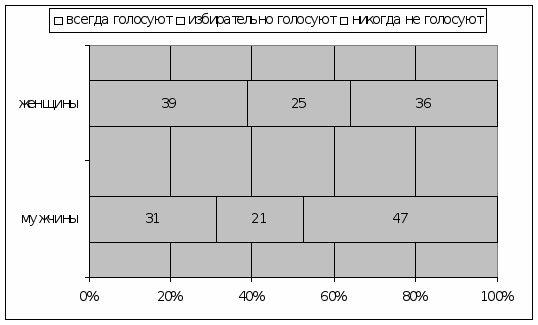 В этой связи интересна статистика, представленная М. Кошелюком и Т. Александровой, согласно которой: «порядка 20% избирателей регулярно ходит на выборы, порядка 40% систематически не пользуются своим конституционно закрепленным правом голоса, а оставшиеся 40% принимают решение в зависимости от конкретной предвыборной ситуации».16