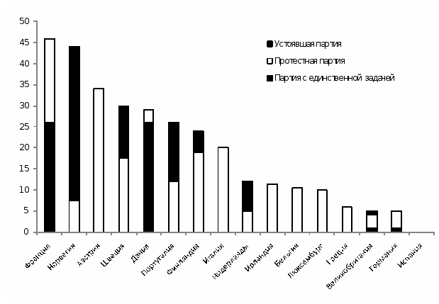 По таблице видно в Приложении 1 видно, что партии первого типа преобладают в четырех странах. Эти партии, в частности, во Франции и Дании появились после референдума принятия Маастрихтского договора. Но нельзя сказать, что во всех странах, где проводились референдумы, есть такие партии. В трех странах (Австрия, Швеция, Финляндия) в 1995 г. не существовало подобных партий, несмотря на то, что общество скептически относилось к ЕС. Причиной являлось то, что уже были организованные, устойчивые партии, воплощающие протестные настроения по отношению к ЕС. В Австрии Партия Свободы Йорка Хайдера служила опорой для оппозиции против ЕС, также как и Партия Зеленых в Швеции, которая впоследствии вновь получила поддержку и вошла в парламент.