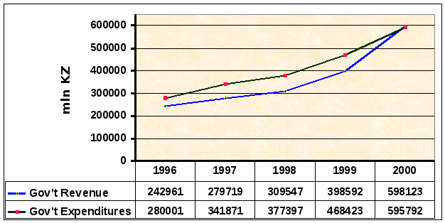 Exhibit below compares government revenues to government expenditures since I996. We see that government spending in Kazakhstan has systematically exceeded revenues, revealing an underlying fiscal deficit between 4 percent and almost 9 percent of GDP, entailing sub>stantial public sector borrowing requirements. Until 1994, fiscal deficit had essentially financed through monetary expansion by the Central bank, with a highly detrimental effect on the rate of inflation during the period. Since then, the National Bank of Kazakhstan has adopted a more independent monetary policy, and fiscal deficits have basically financed either by the proceeds from privatization of state assets or by borrowing foreign loans.