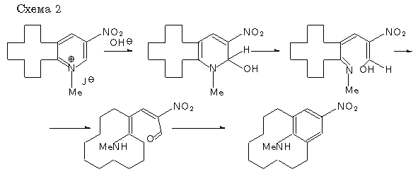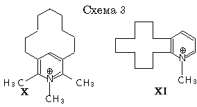 Однако интерес к рециклизации производных пиридина с полиметиленовыми мостиками [6,7] стимулировал изучение круга проблем, связанных с собственным объемом фрагментов рециклизуемых молекул и условиями замыкания циклов. Попытка рециклизации иодметилата метапиридинофана X (11,13-диметил [9](3,5)пиридинофана X) (схема 3) оказалась неудачной, в отличие от рециклизации иодметилата 2,3-циклододеценопиридина XI (отсутствие продукта и выход 6% соответственно).