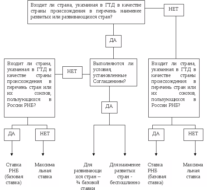 Например, если не определена страна происхождения товара, то взимается максимальная ставка. В том случае, когда товары происходят из стран, с которыми у России установлен РЕЖИМ НАИБОЛЬШЕГО БЛАГОПРИЯТСТВОВАНИЯ (РНБ), при обложении таможенной пошлиной используется базовая ставка.
